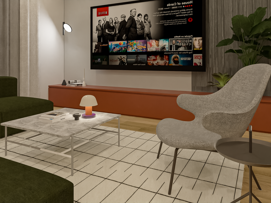 Per questo progetto mi sono occupata del restyling di un soggiorno, trasformandolo in uno spazio più attuale e accogliente senza intervenire sulla struttura esistente.